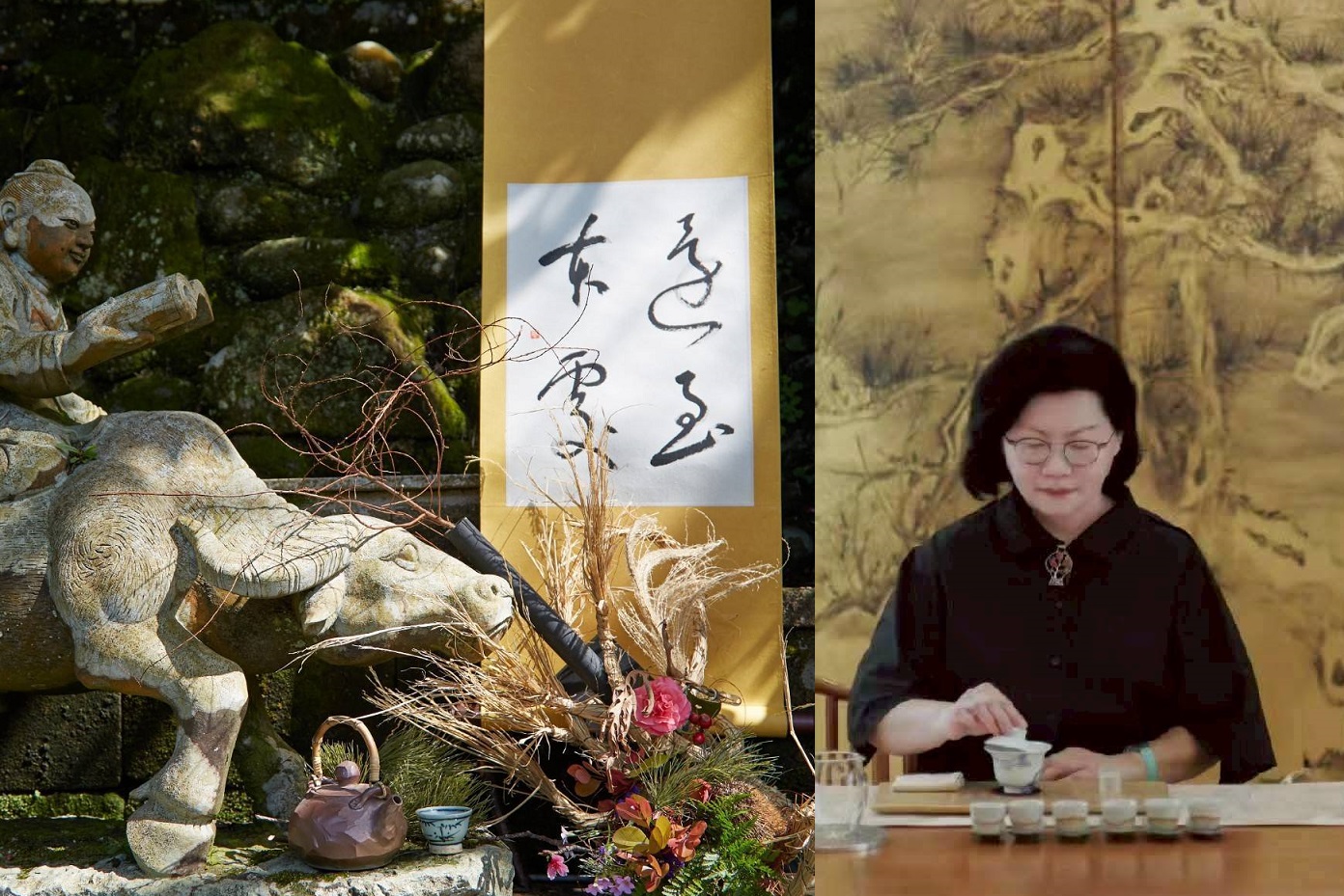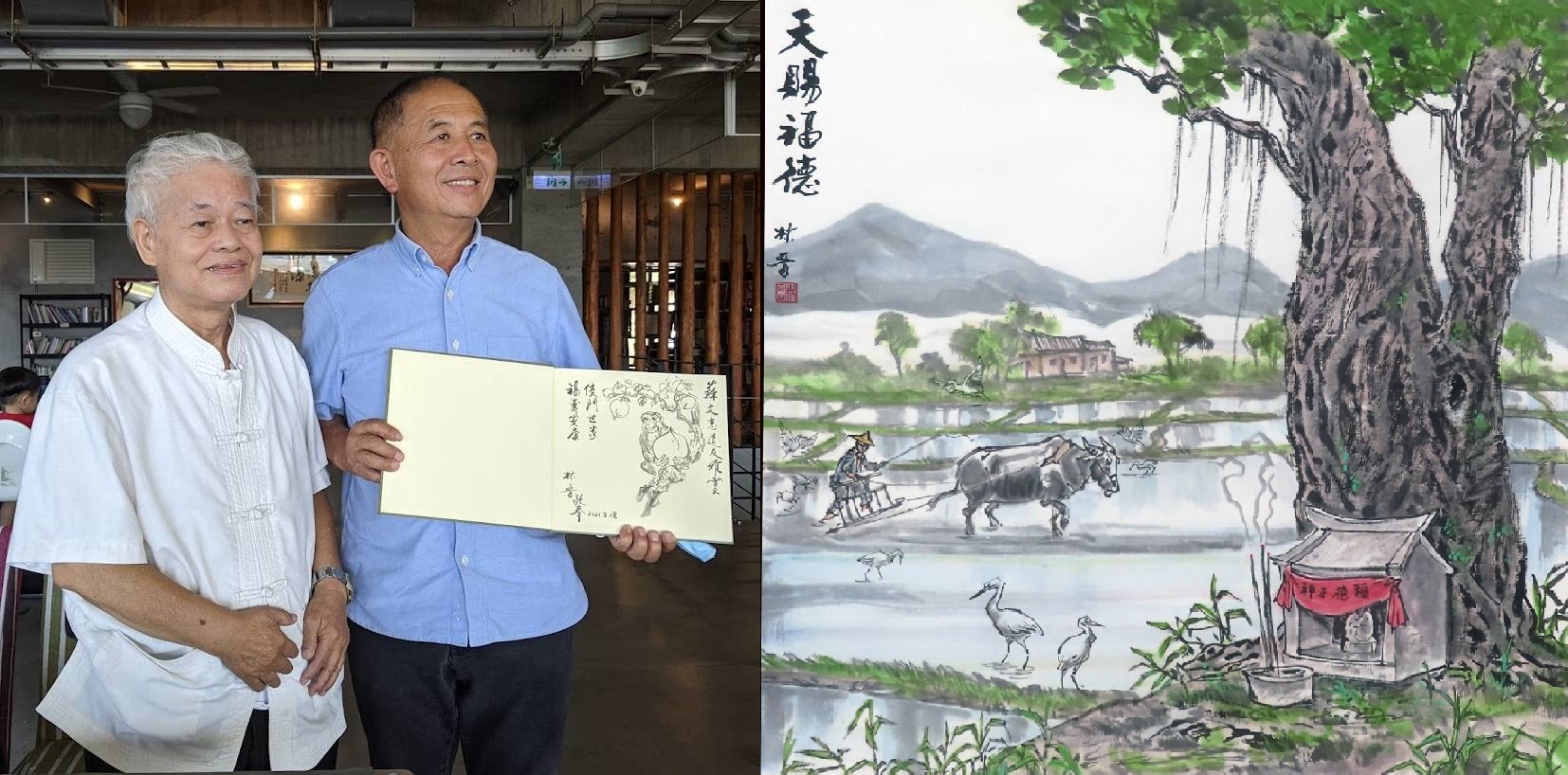 (左) 國寶級天才型原創藝術家林晉及(右)水墨作品「天賜福德」