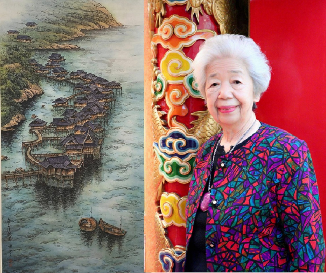 慈善藝術家謝玉花及水墨作品「海上渡假村」。