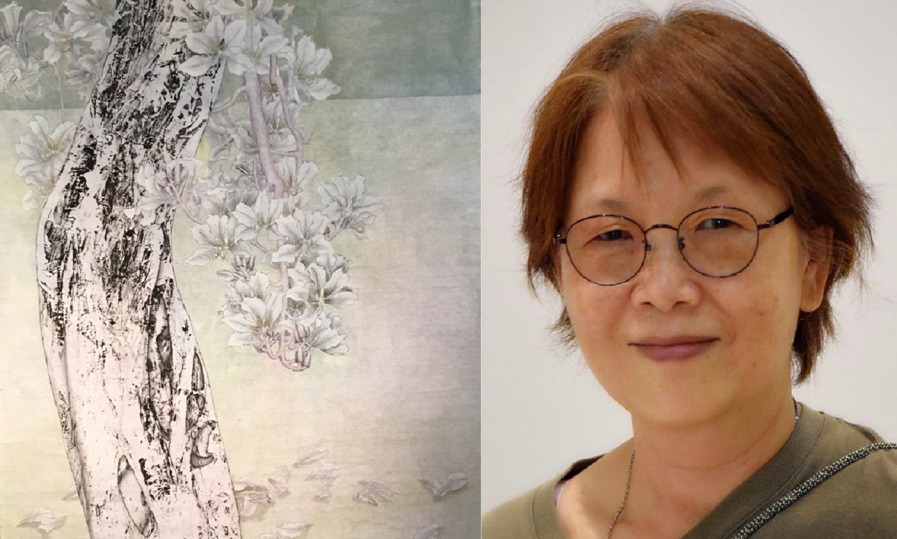 (左) 作品:「一棵開花的樹(春)」_彩墨,複合媒材_88×75cm_2020
