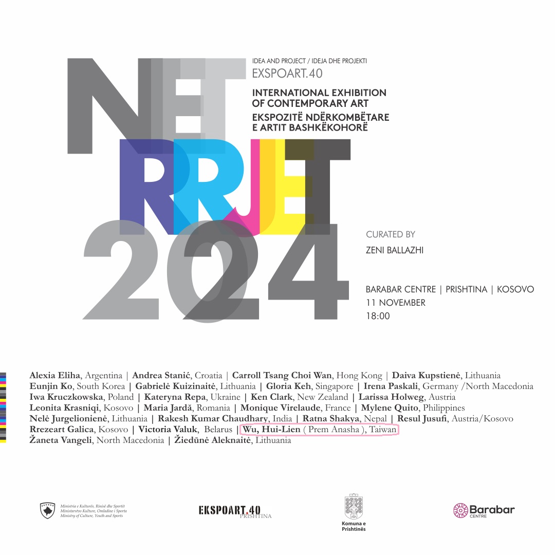 由馬吉琳達·凱爾門迪(Majlinda Kelmendi)藝術指導與澤尼·巴拉吉(Zeni Ballazhi)策展的Expoart.40第12屆 NET/RRJET 國際藝術展( Expoart.40, International Project NET/RRJET-12th Edition, Kosovo )於2024年11月11日晚間六點在科索沃共和國( Kosovo )首都及最大城市普里斯蒂納( Prishtina )的巴拉巴中心 ( Barabar Centre Space ) 圓山大飯店四樓 (Grand Hotel )舉行並正式宣佈對外開放。匯集了來自世界各地的25位藝術家共同參與展示了各地的故事,他們的世界和與主題相關的問題;在這裡,一個小世界被創造出來,每位藝術家都展示了他們在創作這件作品時的關注點。在一個大世界中存在著不同的小世界,”Kelmendi補充道。不同語言和文化的藝術家參加了這個既困難又美麗的視覺藝術主題比賽;每一屆都有一個概念、一個建議、一個改進、一個反叛甚至一個特殊的預測,這些都與當下和時間有關。”Ballazhi表示,他將這次展覽評價為科索沃的文化外交。本展吸引了大批的群眾參觀,蒞臨現場的嘉賓,包括教授、外國組織代表、藝術家、學生、各大媒體、藝術愛好者與廣大的觀眾。本展實體展展期自2024年11月11日至11月17日止, 每日開放時間從中午12:00至17:00止。另安排在線展覽。