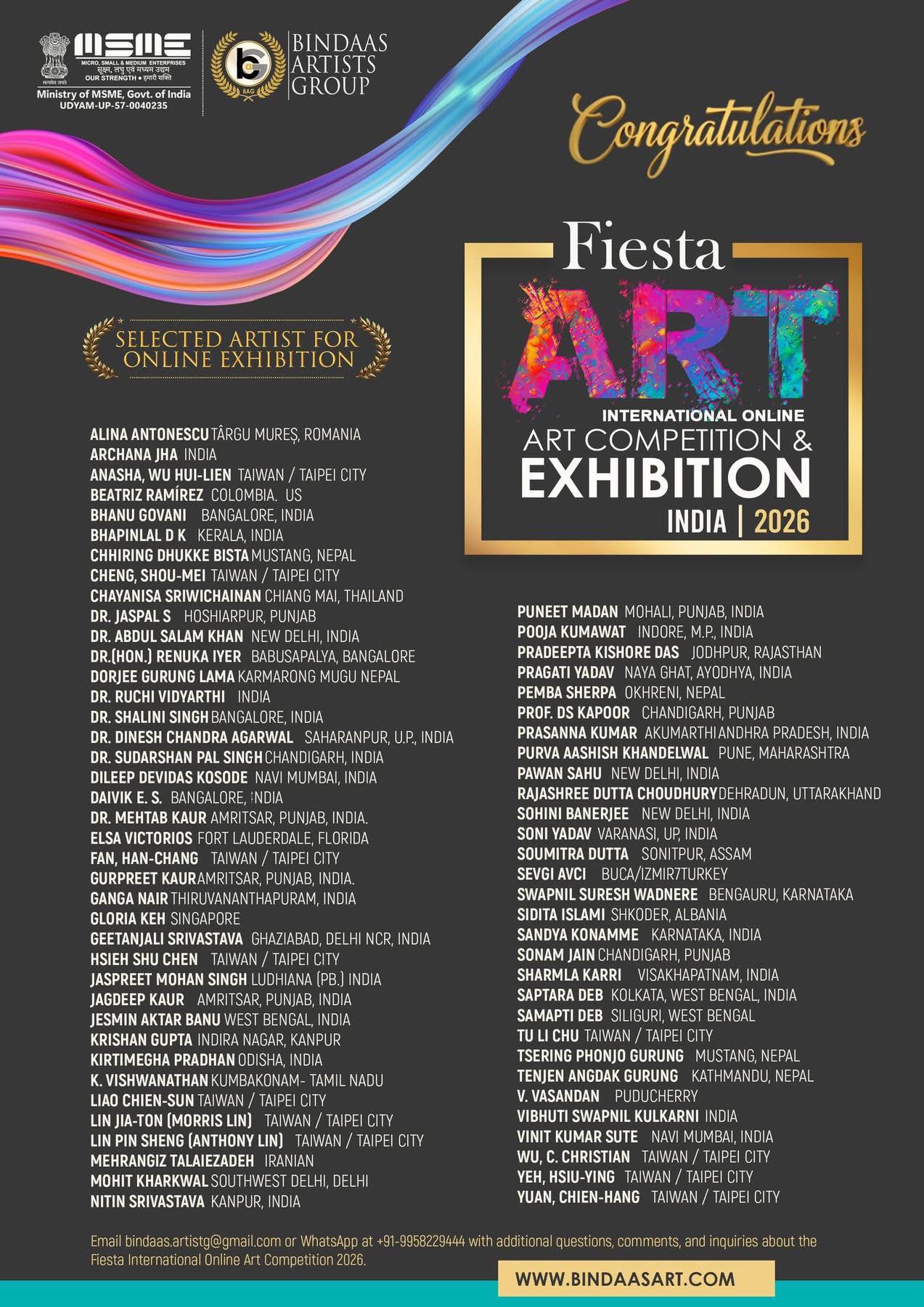 在來自全球眾多藝術好手的激烈角逐下,台灣共有 11 位藝術家憑藉卓越的創作實力脫穎而出,成功入選,備受矚目,展現出台灣當代藝術多元且深厚的底蘊。入選作品領域橫跨當代藝術、複合媒材、觀念藝術與文創等方向,充分展現台灣藝術在當代語彙、文化思辨與國際對話上的深度與多樣性。入選的台灣藝術家為(依姓名筆劃排列):吳慧蓮Wu, Hui-Lien(Anasha)、吳瓊華Wu, C. Christian、杜麗珠Tu, Li-Chu、房漢樟Fan, Han-Chang、林品陞Lin, Pin-Sheng(Anthony Lin)、林家同Lin Jia-Ton(Morris Lin)、袁千航(Yuan, Chien-Hang)、葉修英(Yeh, Hsiu-Ying)、廖建順(Liao, Chien-Sun)、鄭守梅(Cheng, Shou-Mei)及謝淑貞(Hsieh, Shu-Chen)。入選國際藝術大賽不僅代表了個人藝術成就,更標誌著台灣藝術家對於當代美學與多元議題的精準掌握,是台灣藝術與印度及國際藝壇接軌的重要里程碑。