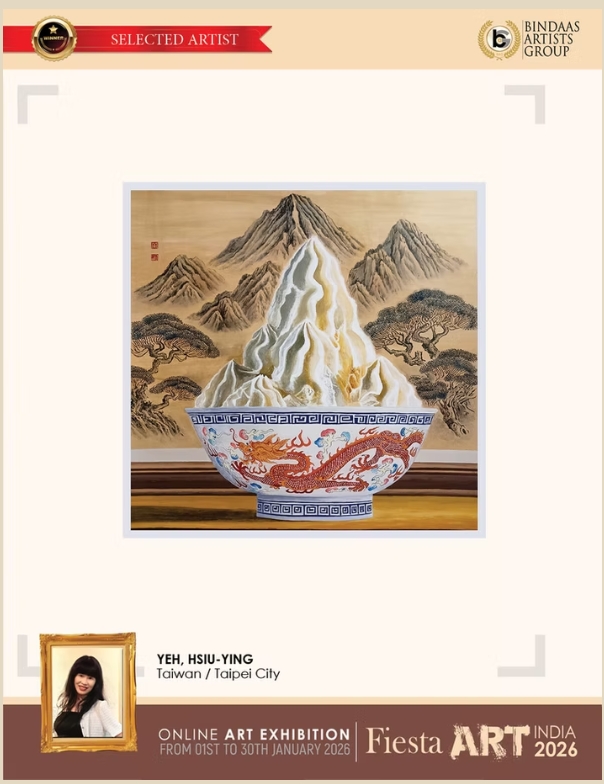 為全球觀眾帶來「冰火交融」獨特視覺體驗的作品「山味」(The Taste of Mountains),驚艷印度「2026國際慶典藝術大賽」(2026 International Fiesta Art Competition, India)。印度知名策展團隊「賓達斯藝術集團」(Bindaas Artist Group)創辦人 拉克什·庫馬爾·喬杜裡 博士(Dr. Rakesh Chaudhary)與評審團一致盛讚此創作,巧妙並置了東方傳統筆墨意境,大膽融入現代日常消費符號,既保有東方美學的內斂與詩性,也不迴避當代現實的矛盾與不安,讓水墨成為一種能夠回應全球語境的思想形式,其視覺美感呈現效果不再只是傳統山水的再現,而是一場跨越時間與文化的「轉譯」行動,形構出既熟悉又陌生、既詩意且具幽默感的視覺實驗能場,以「山水」為媒介,探索傳統與現代、永恆與消逝之間的哲學命題;正是在這樣的張力之中,並重視筆觸的剛柔變化、層次豐富的墨色,更善於透過細膩的形體轉換「異質並置」,以其獨樹一幟的「擬形山水」概念作品,於大賽眾多國際傑作中脫穎而出,榮獲特選佳作。擁有國立臺灣師範大學美術學系藝術學碩士背景的水墨藝術家葉修英,展現出深厚的文化底蘊與當代意義,引發強烈的跨文化時代共鳴。