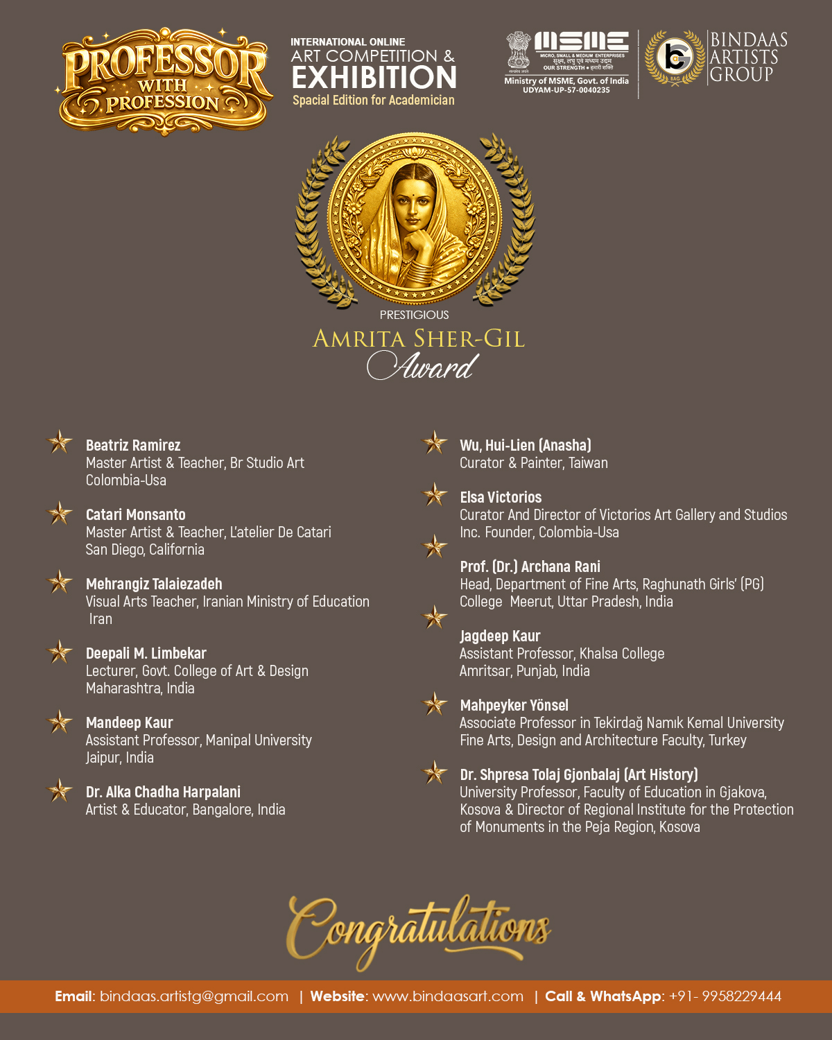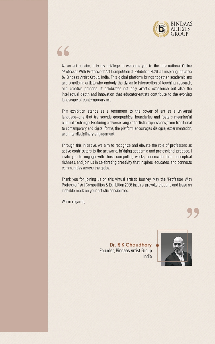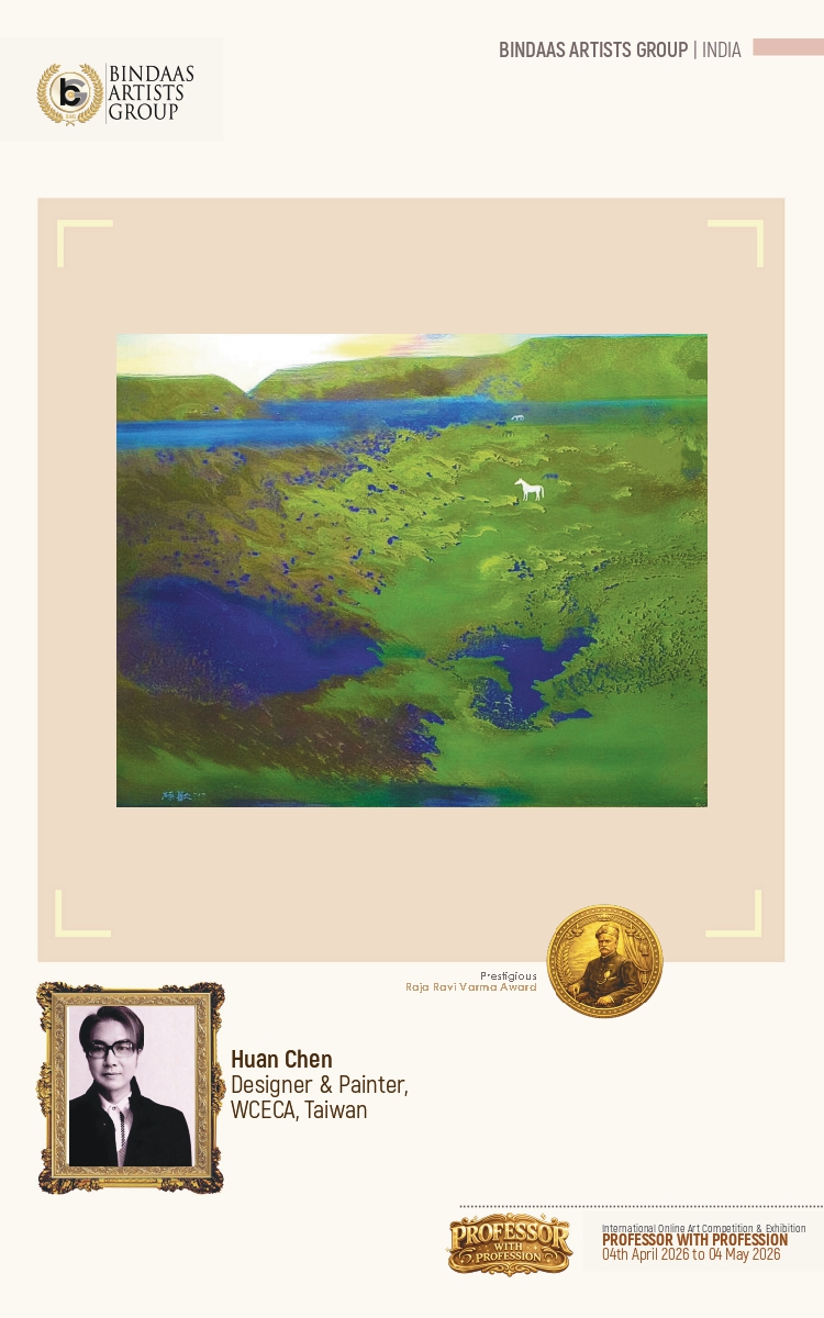 2026年一場專為全球「學術界藝術家與教育工作者」打造的國際專屬盛事——“Professor With Profession” International Art Competition & Online Exhibition(「藝境.職心」2026印度國際藝術競賽暨線上展),於4月4日正式公佈獲獎名單,並同步展開為期一個月的線上展覽。這場國際藝壇矚目的活動,由印度知名策展團隊「賓達斯藝術集團」(Bindaas Artist Group, BAG)創辦人拉克什·庫馬爾·喬杜里博士(Dr. Rakesh Chaudhary)發起並主辦,旨在表彰能將「教學、學術研究」與「專業實務創作」深度結合的教授、副教授與講師等學術從業者以及傑出業師,提供全球平台展示其教學、研究與創作融合的創新作品,促進跨文化交流,參賽作品涵蓋繪畫、數位藝術、雕塑等多類別。台灣World Culture Exchange and Commerce Association (WCECA) 世界文創產學經貿協會 (吳慧蓮理事長)、美國Vision Art Media (Michael Lam)、韓國BIEAF (Yousang Lee)、法國We Are the World Events (Gaspard Stéphanie)、土耳其 International Island Country Artists (Keziban Ertuğrul)、印度Kreative Minds (Amrita Tiwary)、印度GACLW (Dr. Supriya Sanju)、菲律賓Neoma Galleria & Studio Sakura (Angel Gonzales)為其國際間重要策展合作夥伴,共選送多位優秀藝術家參賽,與全球頂尖學術藝術家同台競技。WCECA世界文創產學經貿協會吳理事長共推舉五位台灣藝術家,最終全數獲獎,捷報傳回台灣!