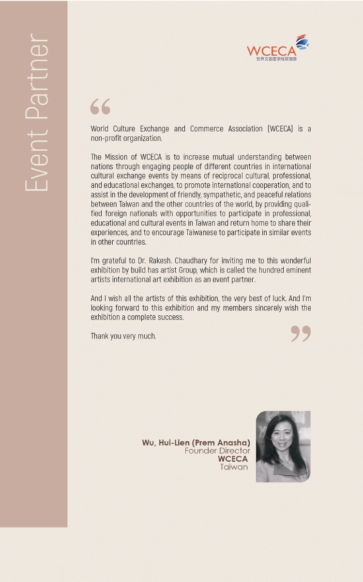 WCECA世界文創產學經貿協會為本次展覽重要的合作單位,致力推廣國際藝術交流。吳慧蓮身兼WCECA理事長、e郵報社長、國際聯合報社執行社長、環球小金人主席、國際策展人及藝術家,同時為玄奘大學藝術設計學院碩士班研究生,長期致力於藝術策展、文化創意產業與國際藝術、商貿及交流平台之推動。此次帶領台灣藝術家於國際競賽中再度嶄露頭角,不僅彰顯個人藝術成就,也體現台灣在全球藝術生態中的關鍵角色與持續影響力。